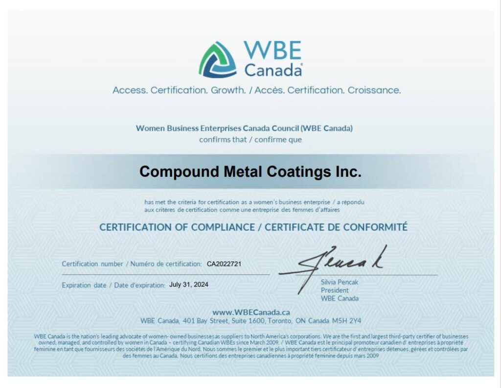 - WBE Canada- CMC is a certified woman's business enterprise.