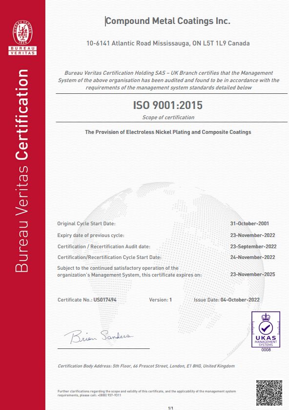 - ISO9001:2015- CMC is Controlled Goods Registered under CGP #17064 - valid until February 2017.